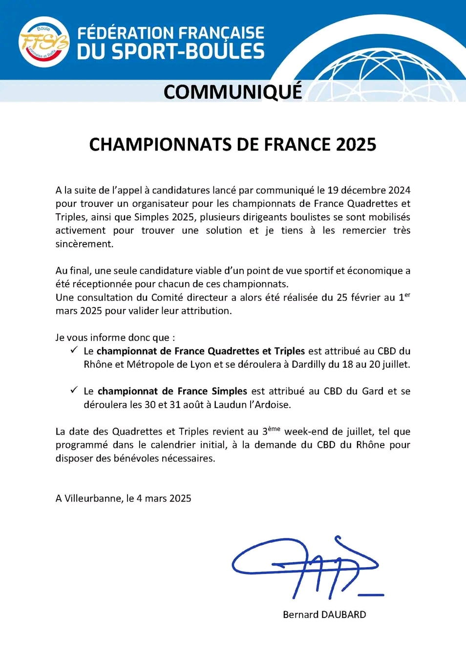 En résumé : Le championnat de France Quadrettes et Triples est attribué au CBD du Rhône et Métropole de Lyon et se déroulera à Dardilly du 18 au 20 juillet. Le championnat de France Simples est attribué au CBD du Gard et se déroulera les 30 et 31 août à Laudun l’Ardoise.