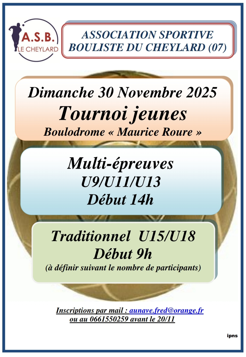 Dimanche 30 Novembre Tournoi jeunes boulodrome du Cheylard (ME U9,11 et 13), Traditionnel pour U15 et 18