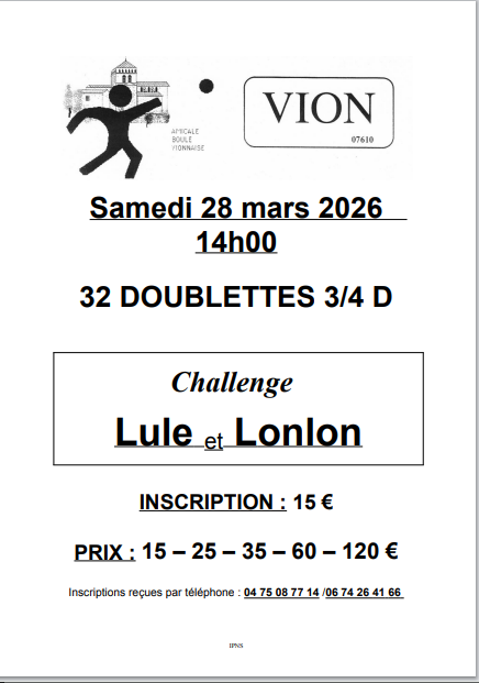 Secteur de Tournon : Concours 32 D Vion 28 mars 2026 REDACTEUR CBD Posted on 17 février 2026 Publié dans Actualités Affiche concours doublette Vion 28 mars 2026